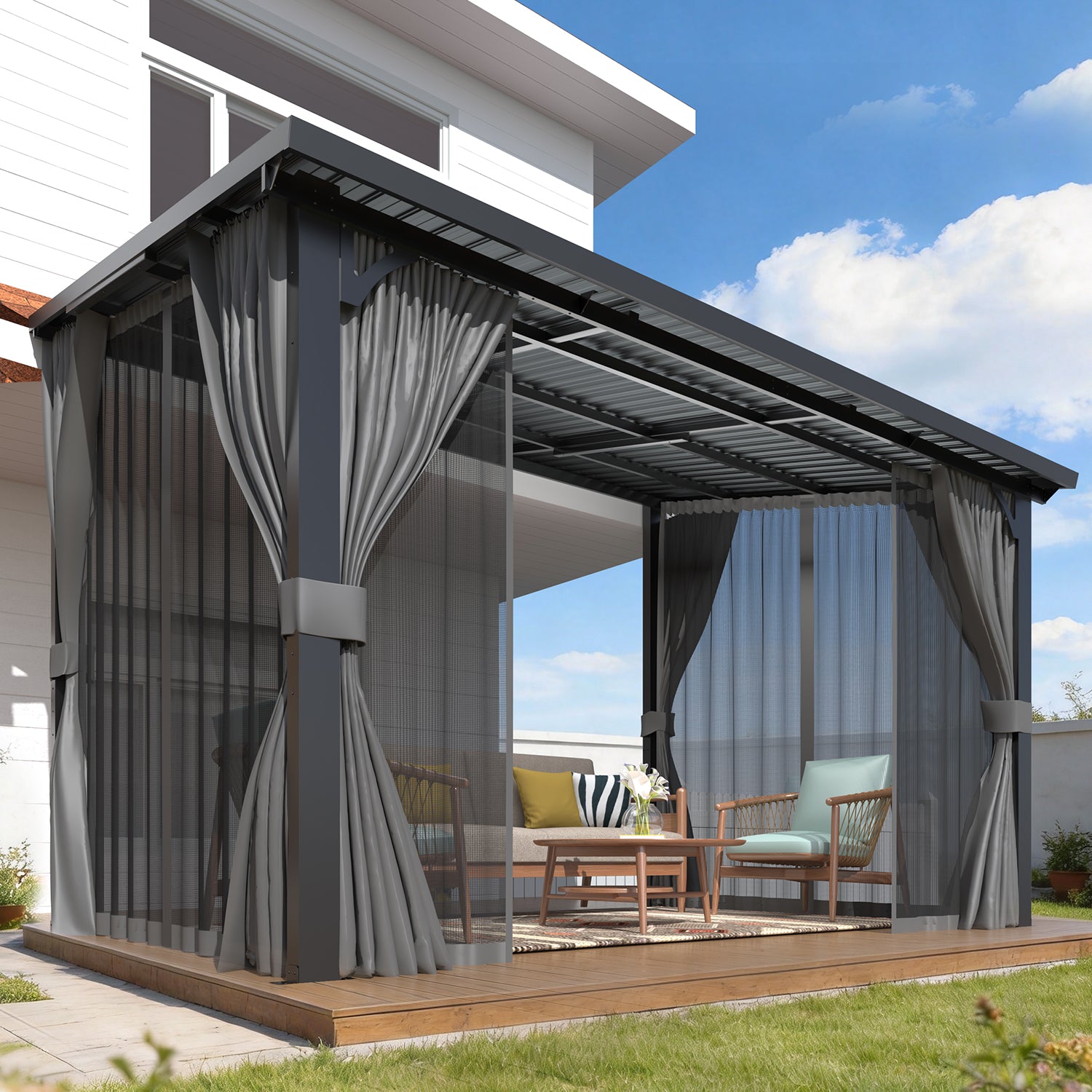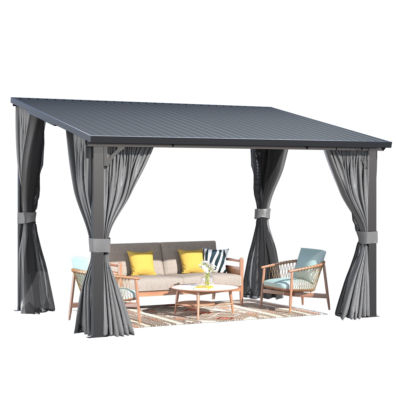 AECOJOY 12×8 ft hard-top gazebo with curtains & netting — weather-resistant outdoor shelter with privacy curtains and insect-proof netting, ideal for patios, decks, and backyard gatherings.