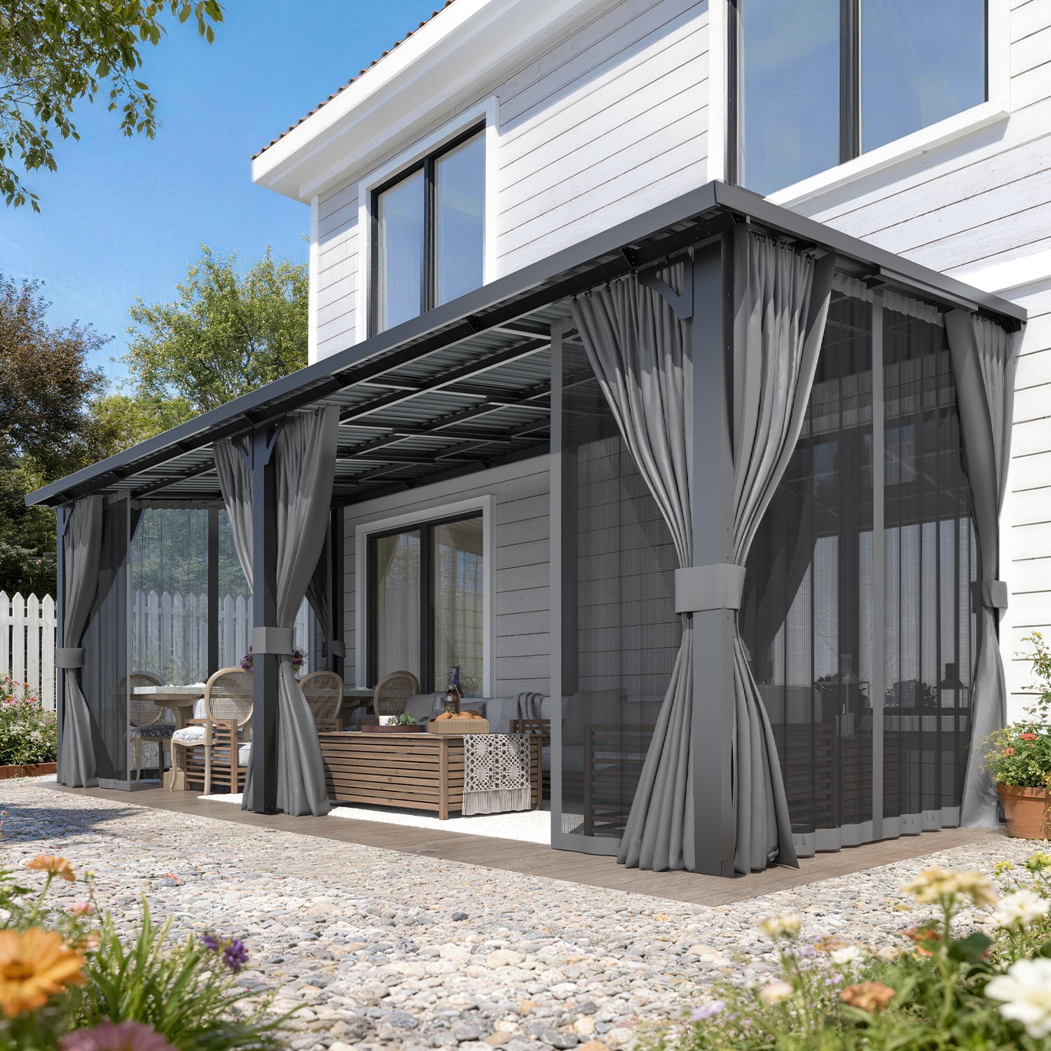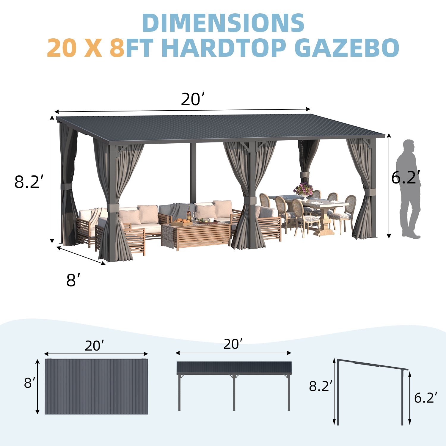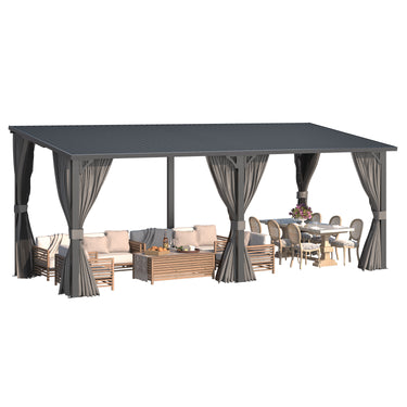 AECOJOY 20×8 ft hard-top gazebo with curtains & netting — weather-resistant outdoor shelter with privacy curtains and insect-protecting netting. Perfect for patios, decks, and backyard relaxation.