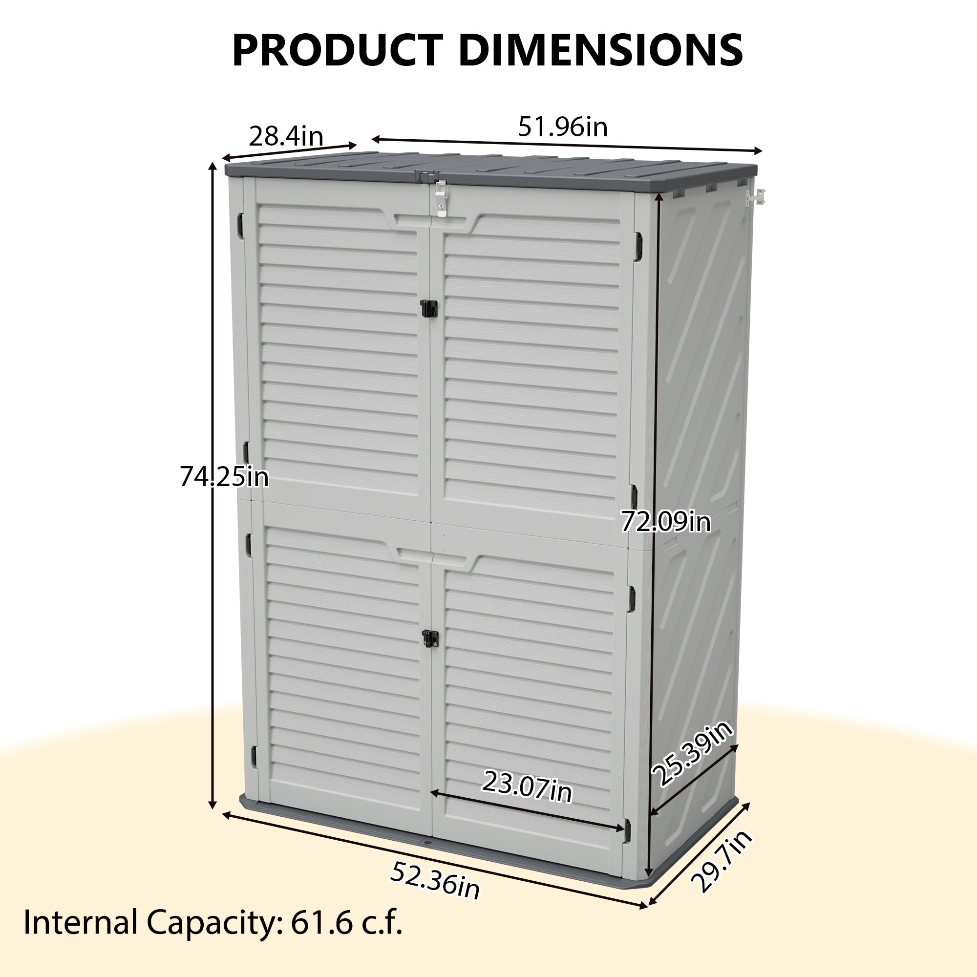 - Large Capacity Outdoor Storage Cabinet: This storage cabinet measures 74.25 inches in height, 52.36 inches in width, and 25.39 inches in depth, offering an interior capacity of 61.6 cubic feet. The internal structure is designed reasonably, capable of storing a variety of items, from tools to seasonal decorations, all in an organized manner.