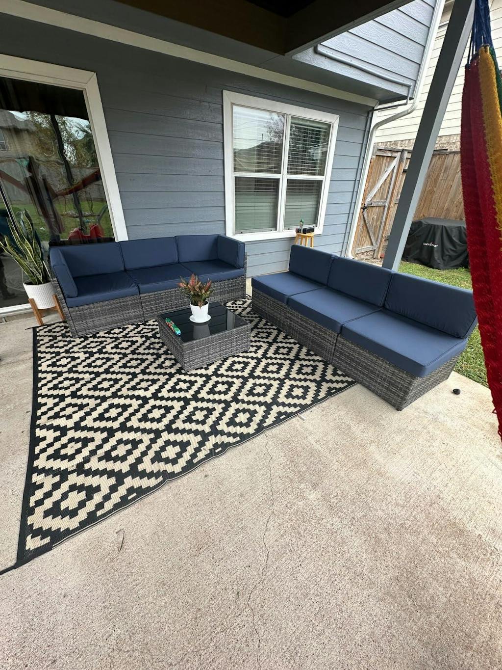 Transform your backyard into a relaxing retreat with this 7 piece patio furniture set featuring sleek navy cushions and elegant gray wicker. Designed for both comfort and style, the L-shaped rattan patio furniture set includes a spacious glass-top coffee table and thick padded cushions that are water-resistant and easy to clean. Whether you're hosting friends or enjoying a quiet evening, this set fits right in with sectional furniture sets for modern outdoor living. As part of our clearance outdoor conversation sets, it's a great way to elevate your space without breaking the bank. Discover the charm of versatile patio furniture sets 7 piece that combine durability with design.
