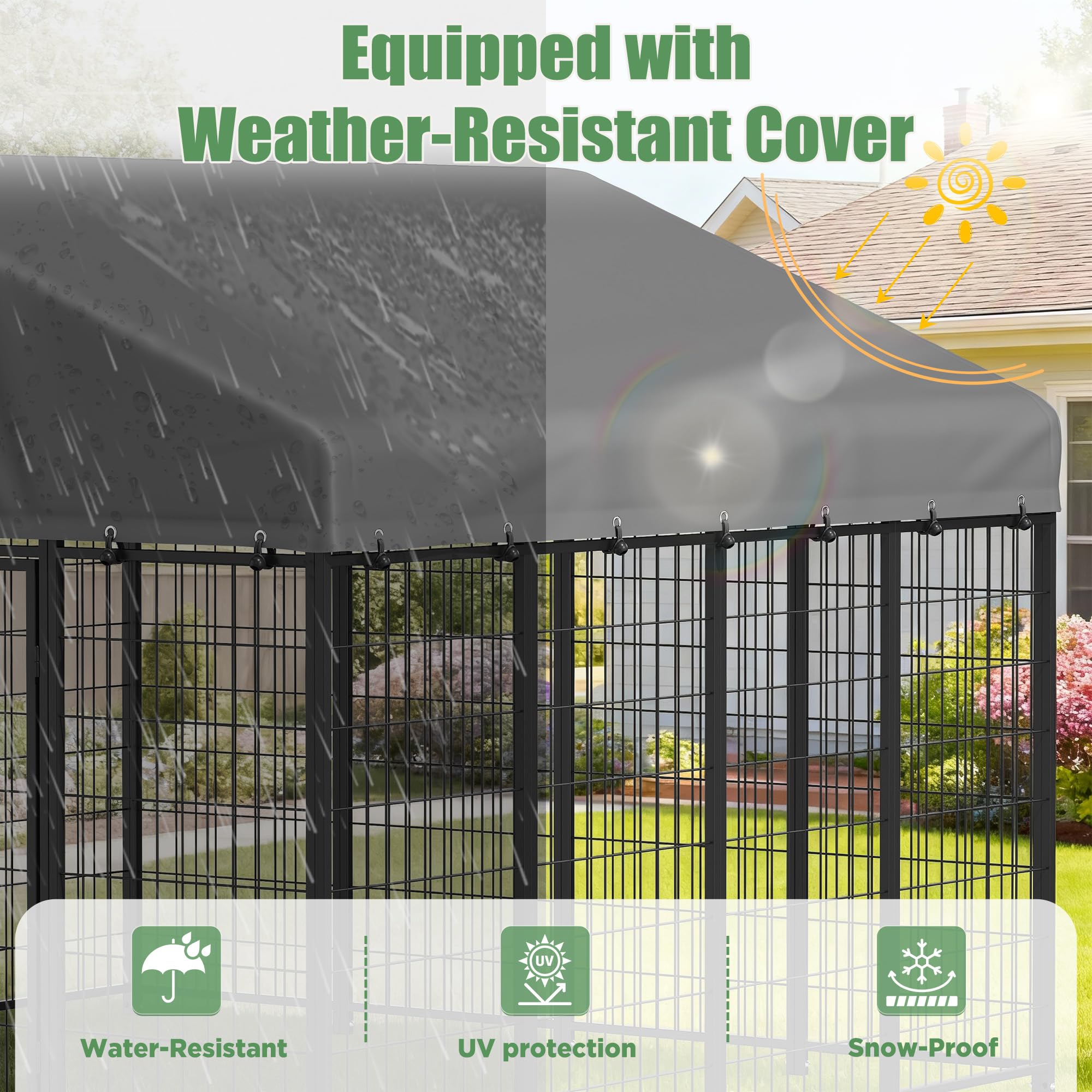 The AECOJOY Heavy Duty Outdoor Dog Kennel is a durable 8x8 feet steel chain link fence with a waterproof roof, providing a safe and comfortable outdoor space for your pets.