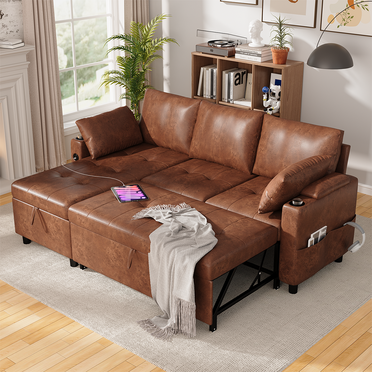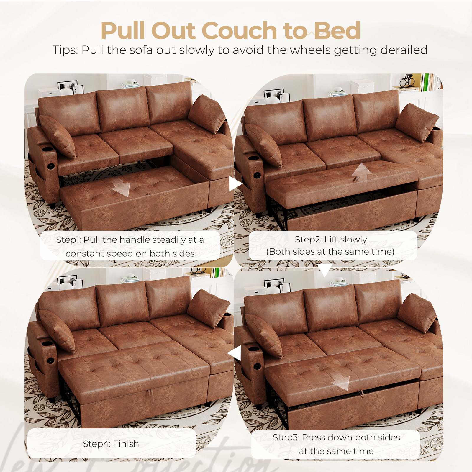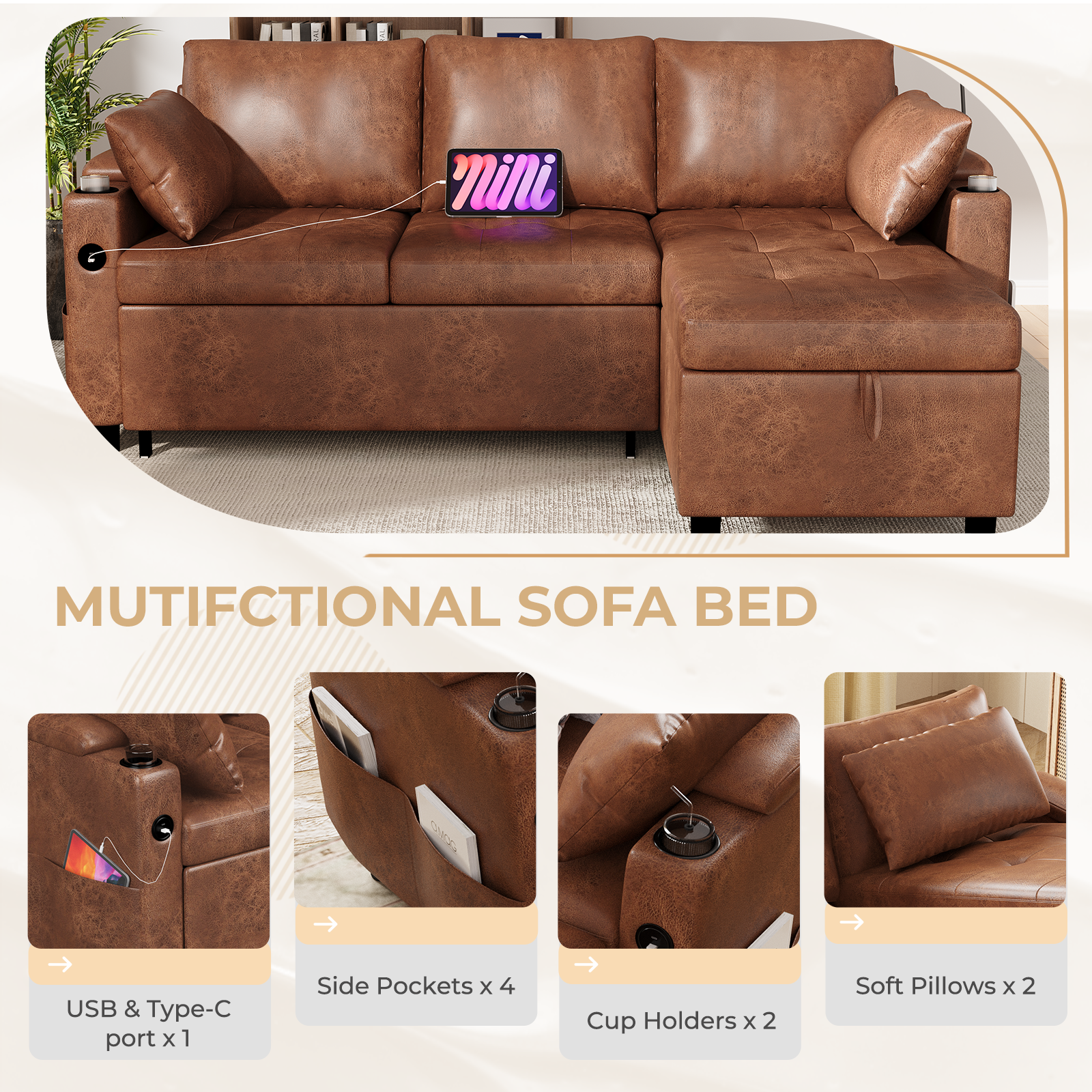 AECOJOY Sleeper Sofa Couch with Pullout Bed, Faux Leather, Brown
