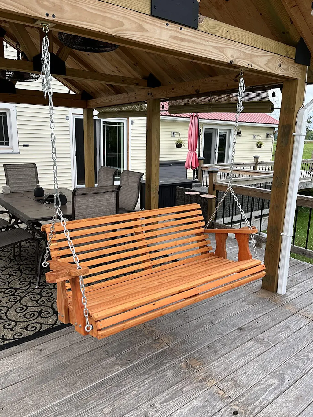 1.Is this wooden porch swing weather-resistant? Can it stay outside year-round?