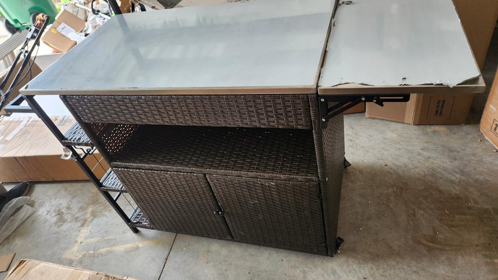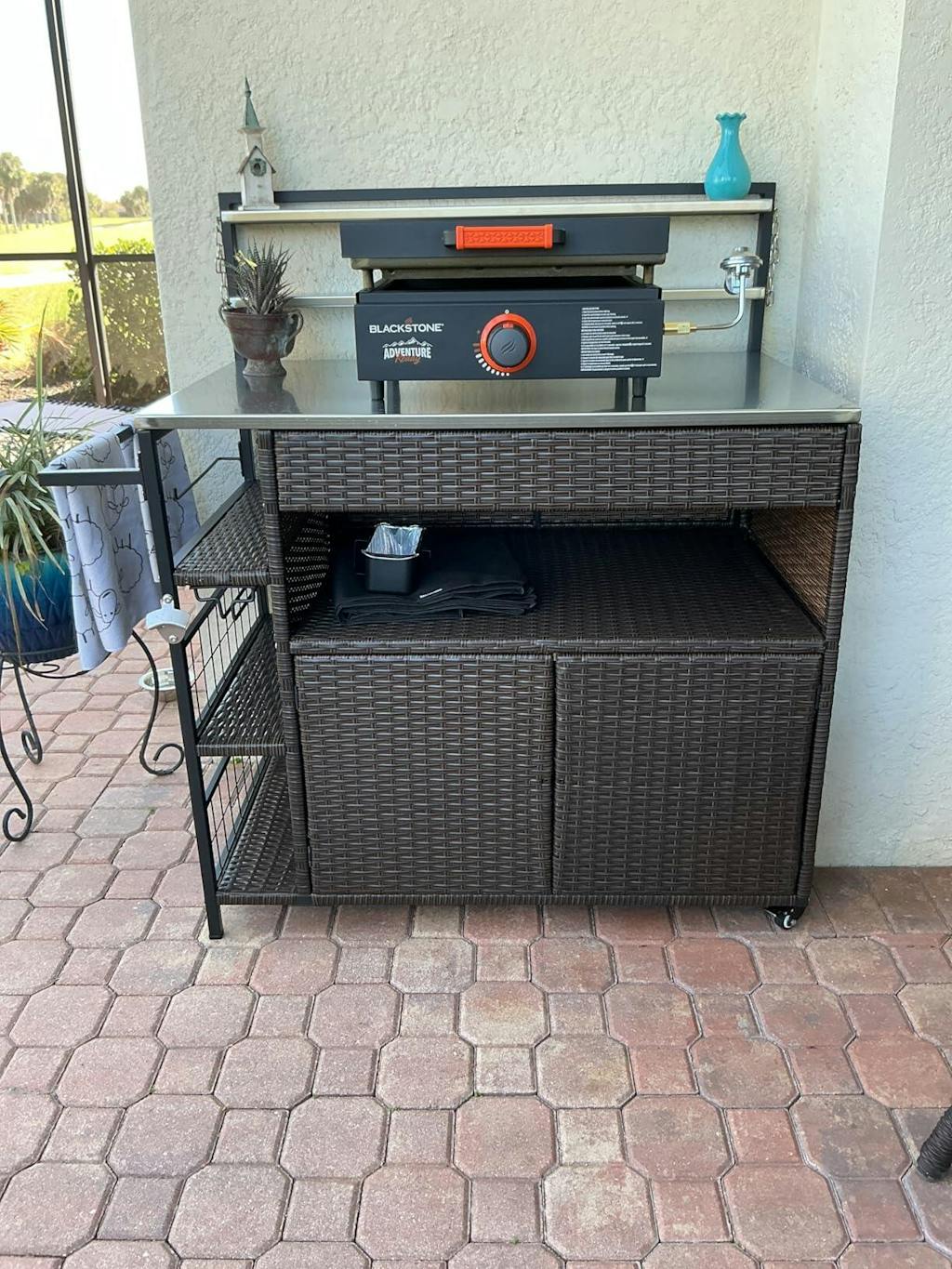 Elevate your outdoor entertainment with this bar cart with wheels, designed for effortless mobility and elegant functionality. Crafted with a durable metal prep tabletop and a beautifully woven rattan bar cart storage cabinet, this cart combines style with practicality. The spacious outdoor bar cart with storage features a built-in bar cart with wine rack, a glass holder, and ample shelving to keep your drinks, glassware, and bar essentials neatly organized. Whether you're hosting a backyard party or a casual get-together, this bar cart rolling ensures smooth movement with its sturdy wheels, making it the best bar cart choice for patios, gardens, and poolside gatherings. Its weather-resistant design ensures long-lasting use, while its modern aesthetic complements any outdoor décor.